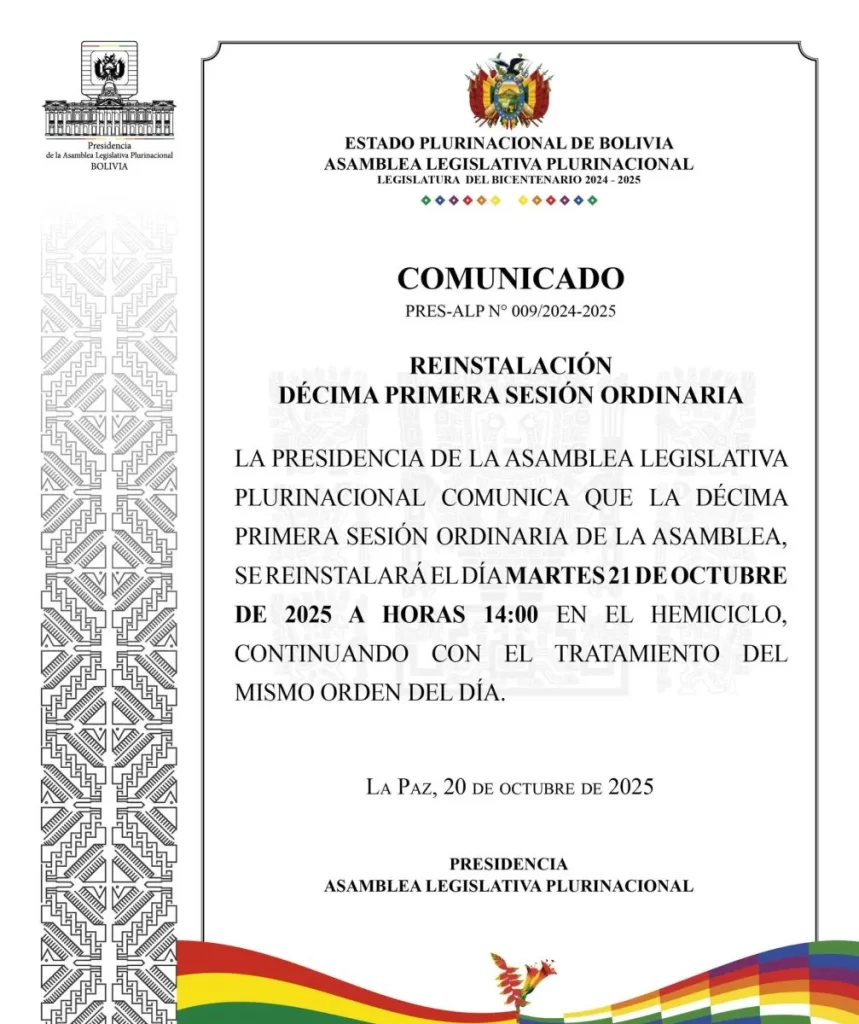 La Asamblea Legislativa Plurinacional (ALP) retomará este martes 21 de octubre la sesión suspendida la semana pasada, en medio de tensiones políticas por la designación del nuevo contralor general del Estado. La convocatoria fue realizada por el presidente del Legislativo, David Choquehuanca, quien fijó el reinicio de la sesión para las 14.00 en el Hemiciclo.
